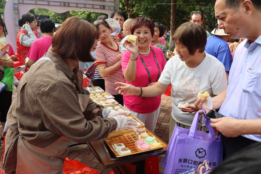 在文化体验区,“巧手做香囊”活动吸引了不少老人参与。大家亲手辨识药材、研磨装袋,制作出一个个寓意吉祥的中草药香囊。“这中草药闻着很舒服,做个香囊挂在家里,既好看又吉利!”许多阿姨拿着自己刚做好的香囊,笑意盈盈地说道。现场还设有重阳糕品尝环节,由本地“稻香糯语”米糕工作室精心准备的花式重阳糕,让老人们在品尝中感受节日的甜蜜与温暖。