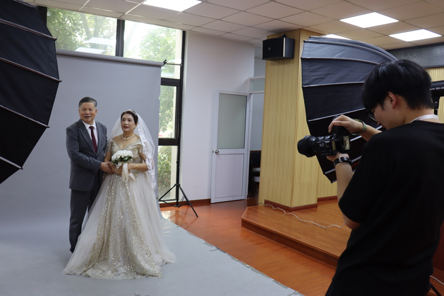 公益拍摄区同样温情满满。金汇居委会联合万祥金邸物业服务中心、情暖夕阳公益拍摄组,为辖区中老年夫妇免费拍摄结婚纪念照,弥补他们年轻时的遗憾。每对夫妇还可免费获得1幅36寸挂画和1张最美证件照电子底片。一对对夫妇在镜头前笑容灿烂,定格下相伴多年的幸福瞬间。携手45年的陆泉林和吴喜珍夫妇感慨道:“以前没拍过婚纱照,感谢社区给我们这个机会,心里特别暖。”